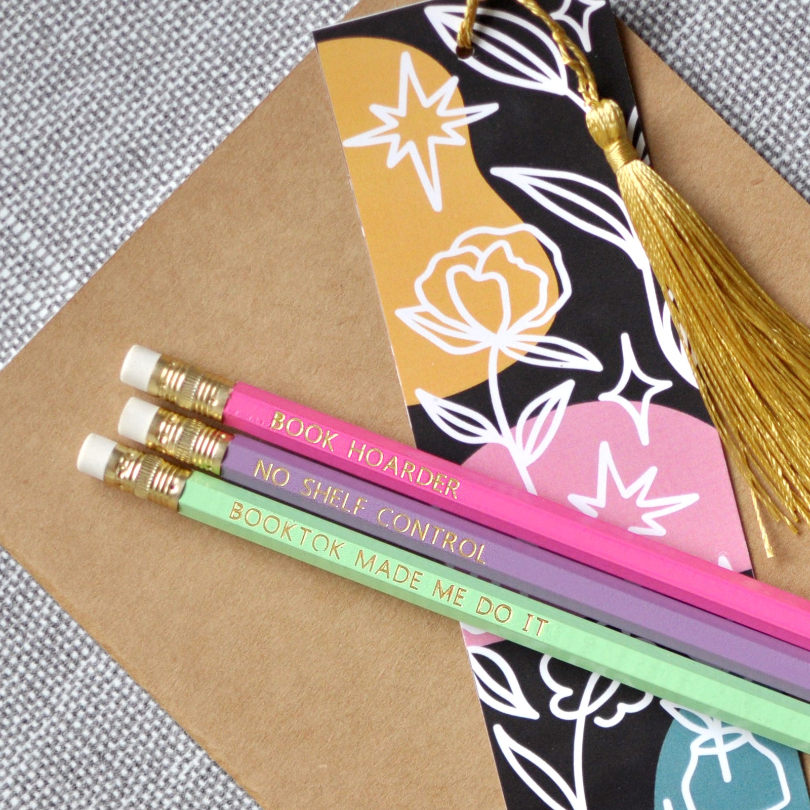 $10.50 USDThree Pencils and Bookmark Set for Booktok Friends - Book Hoarder, No Shelf Control, and Booktok Made Me Do It foil stamped pencils
