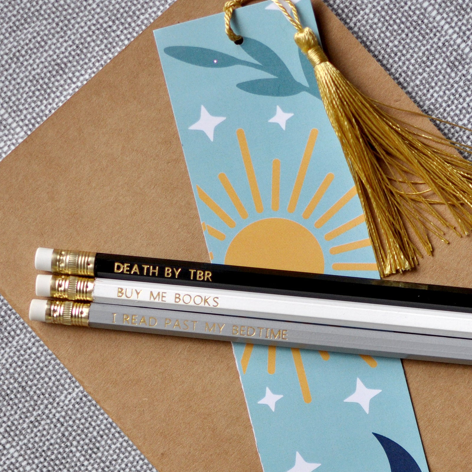 $10.50 USDThree Pencils and Bookmark Set for Book Lovers - D**th By TBR, Buy Me Books, I Read Past My Bedtime foil stamped pencils